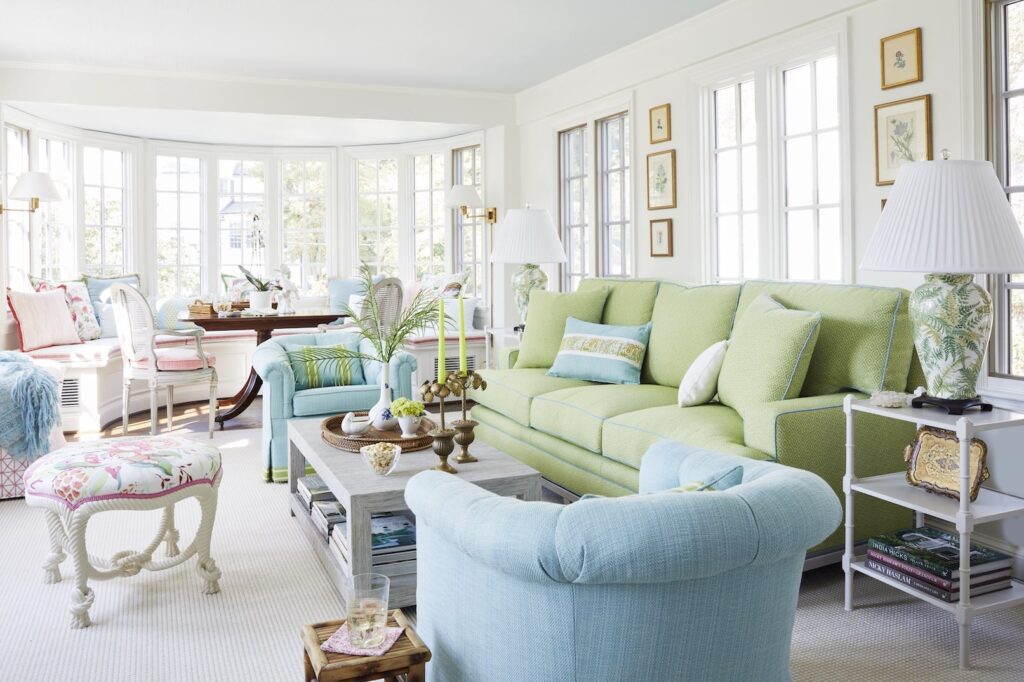 Kelley Proxmire of Kelley Proxmire, Inc., www.kelleyproxmire.com, recently designed a family room around furniture the owners inherited from a relative’s home in Palm Beach. She created a refined space with repurposed elements in her signature blue and green colors.