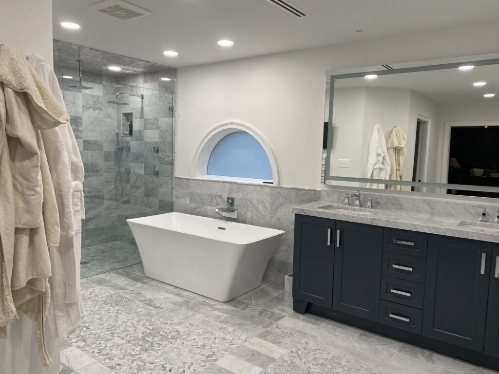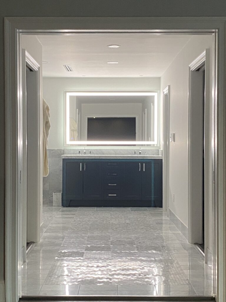 Looking back, a few things that I would have done differently revolved around double and triple checking items when they arrived along with measuring items prior to installation. An example of this is the large lit mirror in our bathroom. The box arrived in good condition and I signed for it. The mirror sat in the garage safely tucked away for a good month. The day of installation, the team opened the box only to see that it was shattered in one section. We were all disappointed – even the crew! If we had opened the box prior to installation, we would have seen the damage. Although the company we purchased it from was incredibly easy to work with and replaced the damaged item, it took quite a bit longer to receive it.