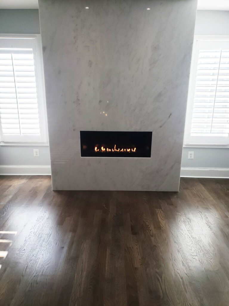 The bathroom turned out beautifully, but one of the most striking differences was the second part of the renovation – the fireplace in our bedroom. My husband and I knew what we wanted, but we just didn’t know how it could be accomplished given the setting of the fireplace. Again, John and Trevor spoke with Frank, and they were able to perfectly capture and deliver the striking statement fireplace we envisioned. The floor to ceiling quartz fireplace is beyond stunning and completely changes the look of the room.