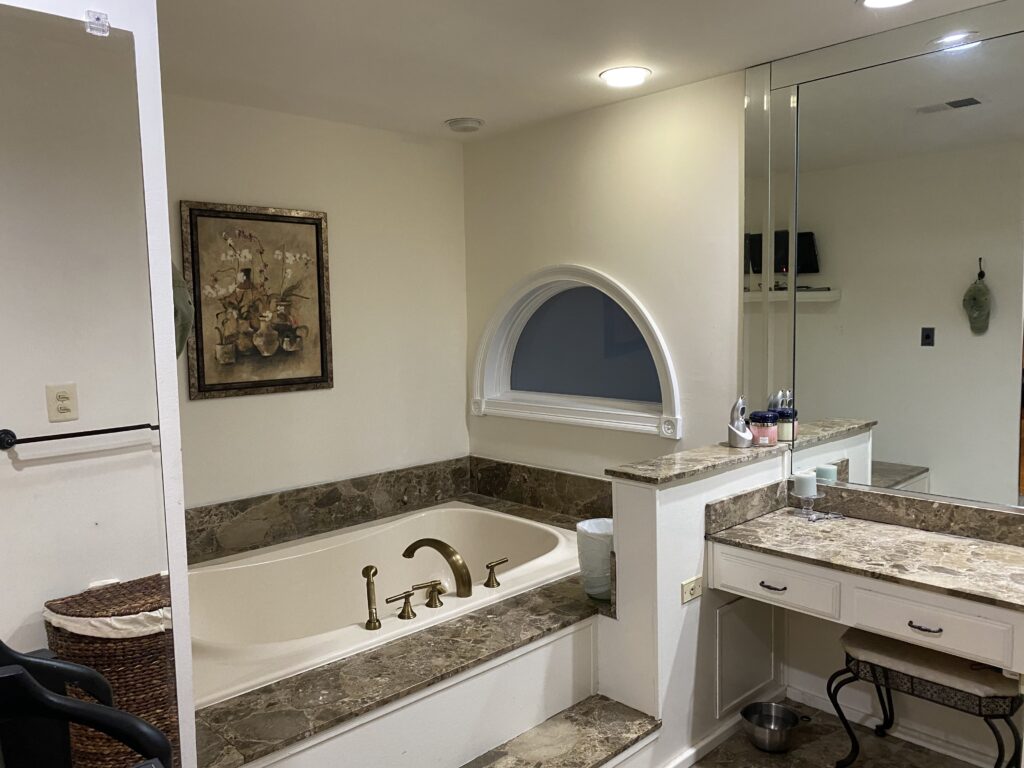 To understand – the original bathroom had (what I would imagine to be considered) a very upscale design 30 years ago. A huge, raised jet bath, a large (and very low) vanity with one sink. Another sink was in the water closet which also housed a washer and dryer. It was such a strange layout that we only used the sink in the main bath area and never used the washer and dryer. (We quite honestly were worried it would leak if we did.) As time wore on, we continued to have more leaks pop up. One from the bath. Then the main faucet started to drip and wouldn’t shut off. Another plumber told us that there was no way to fix the leak without changing out the faucet and plumbing underneath, so we just lived with it that way for a while. We viewed our bathroom as purely utilitarian. We used it because we needed to. We didn’t spend any extra time or energy on it. We focused on the other parts of the house that needed work. It was also overwhelming to think of to plan the layout the bathroom and closets. Our lack of vision and creativity and how to best utilize the space led us to talk about it and talk about it and talk about it for four years without moving forward. My husband and I knew that we wanted to renovate it, but we needed some serious help!