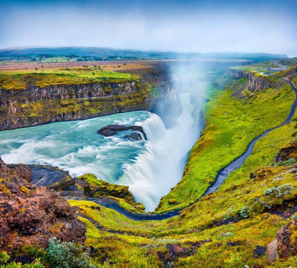 Another of Iceland’s main attractions is the Gullfoss Waterfall, located in the Golden Circle. It is one of Iceland’s most iconic and beloved waterfalls. Its name translates to ‘Golden Falls’ and is so cherished for its uniqueness and beauty. The falls are created when water from the Hvítá river flows southward and then turns sharply to the right and down a wide curved three-step “staircase.” It then abruptly plunges in two stages (36 feet, 69 feet) into a crevice that is 105 feet deep. It is a spectacular sight.