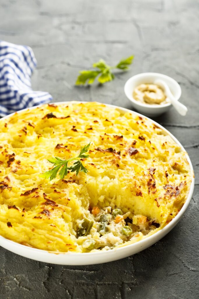 Transfer mixture to prepared pan. Top with mashed potatoes. Smooth evenly.