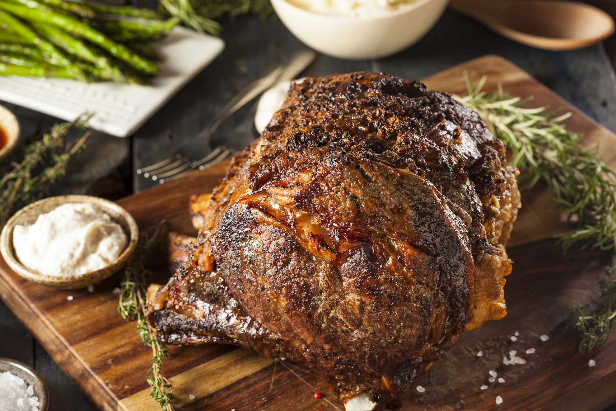 The day before serving, remove the roast from the package and dry thoroughly with paper towels. Set the roast on a baking sheet and place in refrigerator overnight. Remove from the refrigerator 1 hour before cooking time to allow meat to reach room temperature. Rub the roast all over with horseradish and Dijon mustard. In a bowl, mix together the kosher salt, black pepper, thyme and garlic powder; sprinkle the spice mix over the roast.