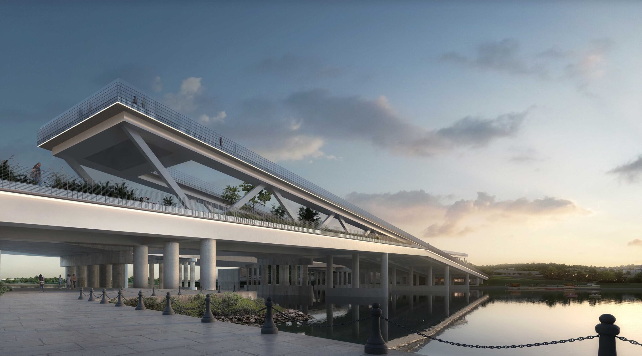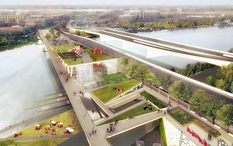 The 11th Street Bridge Park, a partnership between the Ward 8-based nonprofit Building Bridges Across the River and the District Department of Transportation, will be Washington, D.C.’s first elevated public park. Located on the piers of the old 11th Street Bridge spanning the Anacostia River, the Bridge Park will be a new venue for healthy recreation, environmental education, and the arts. After a seven-month design competition, the design team of OMA+OLIN was selected in October 2014.