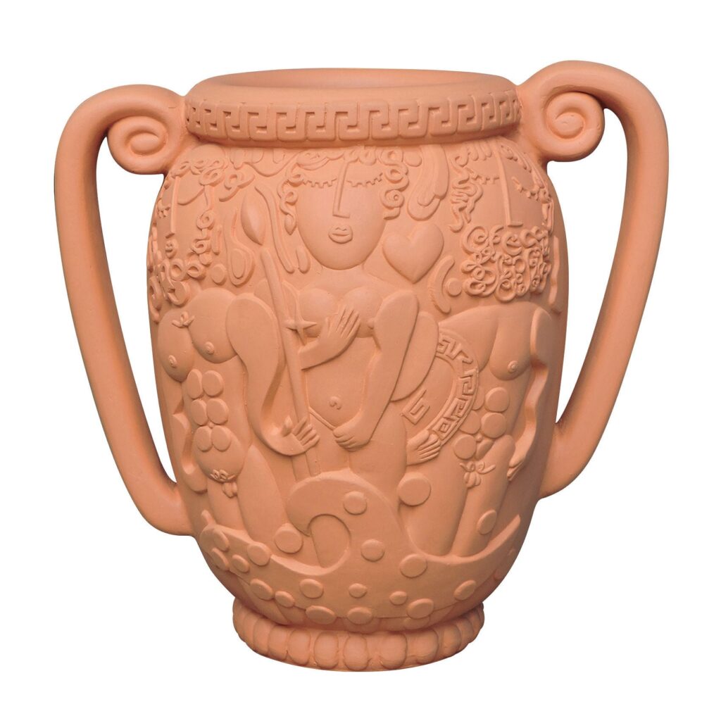 Decorative objects include the busts Man and Poppea, along with two large and sensual ‘bronzes’ inspired by the famous sculptures of Riace. Vases take the shape of male and female heads inspired by the ceramics of Caltagirone, while a cup and an ‘amphora’ jar show battle decorations and love scenes.