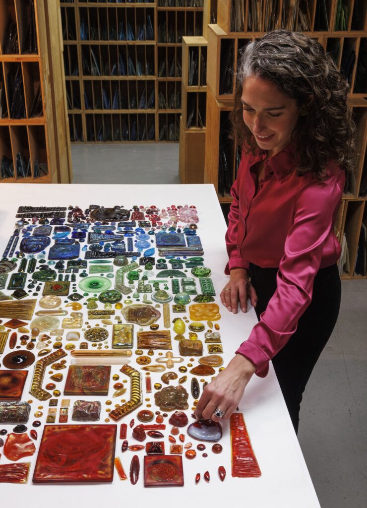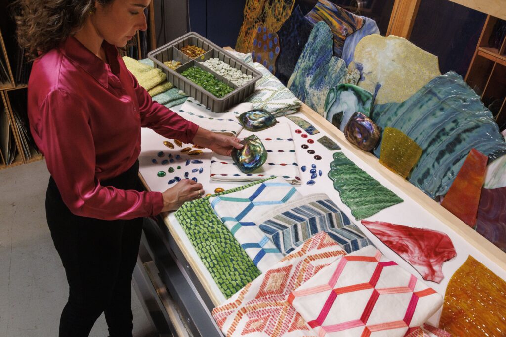 In 2017, Ellen Kravet invited me to spend the day at the Neustadt Collection of Tiffany Glass in Queens New York. The Collection houses a quarter of a million pieces of the Tiffany Studios archival glass. The glass is catalogued by color, size, and technique, ranging from pieces that are 24”x24” to small 1” jewels. I was speechless, I couldn’t believe what I was seeing. A feeling of inspiration overwhelmed me. In that moment I knew there was something I had to create. This beautiful glass belonged on fabric. To take one medium- glass and interpret it into another- fabric, connects this work to Tiffany.
