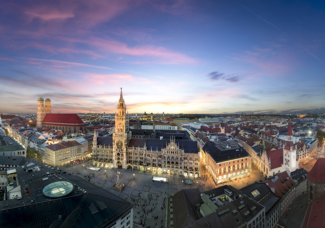 Aerial view of beautiful Munich Old Town at sunset