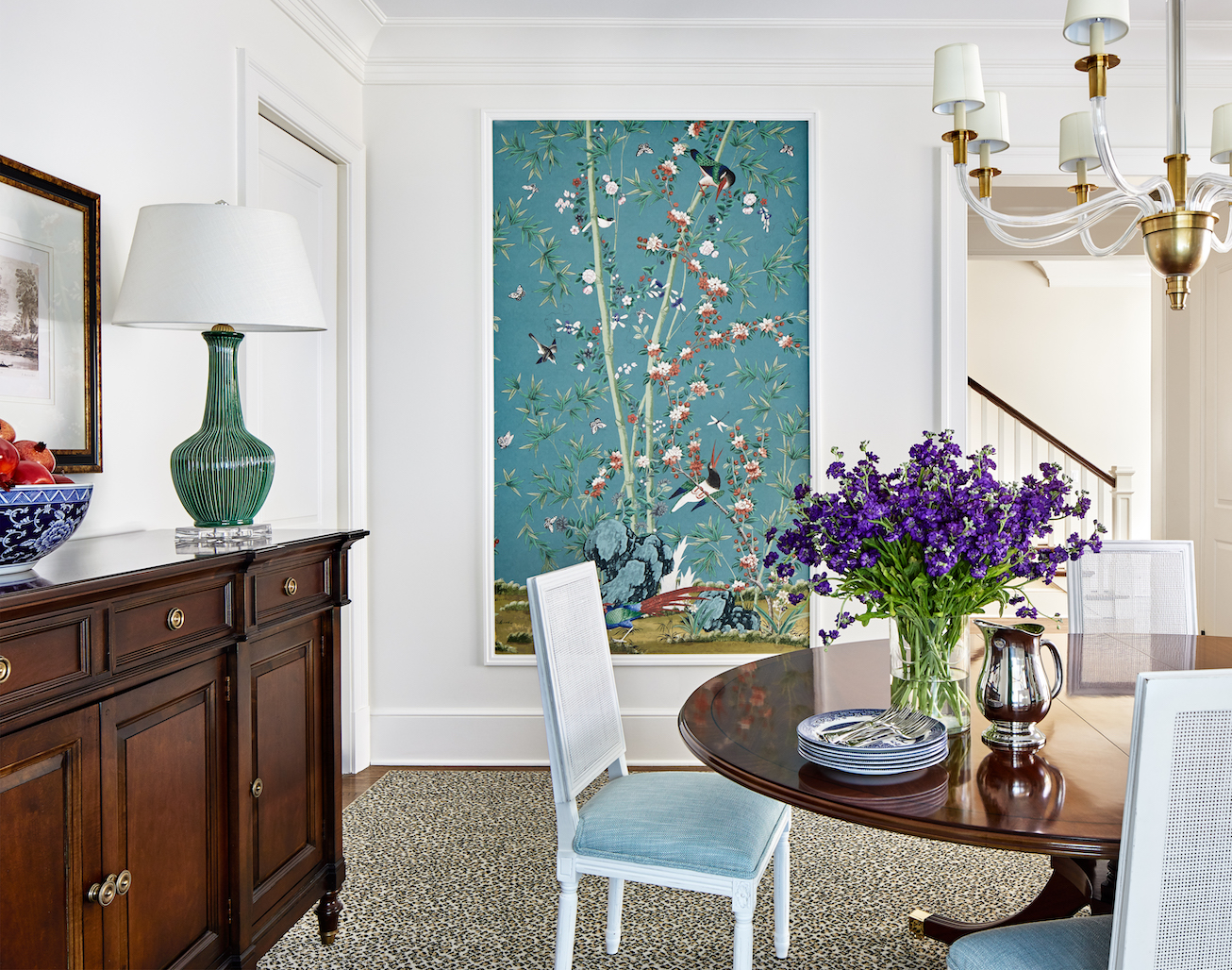 With a background as an art historian, designer Annie Elliott is always looking for creative ways to add art to a space. In this dining room, she installed a panel of Schumacher’s Brighton Pavilion on the wall and had her painter frame it in picture molding. “We wanted it to look like part of the room decoration, not a framed piece,” Elliott says.