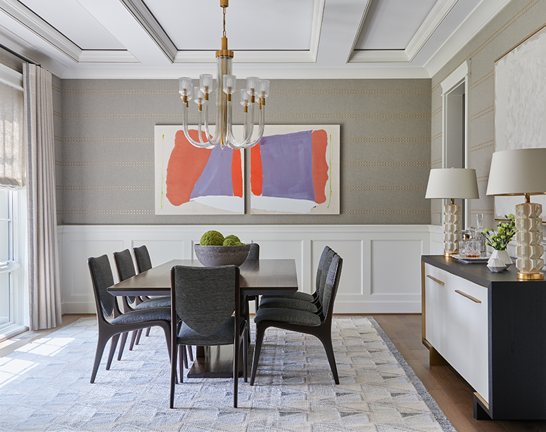 In this dining room, Designer Tracy Morris added a rug by Matt Camron Rugs featuring tones of lavender, cream, gray, and white to allow the darker tones in the table, sideboard, and floor to really pop. “I love the rug in the space because it complements the high-contrast elements in the room,” Morris says.