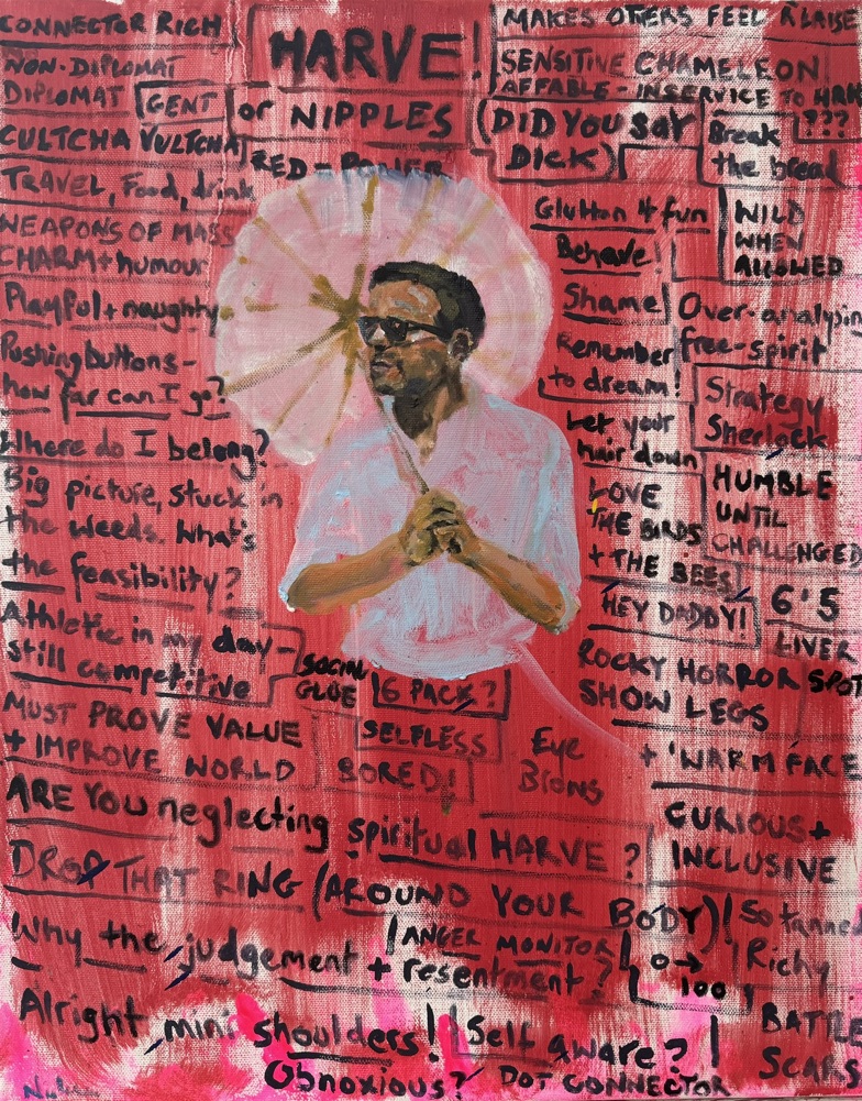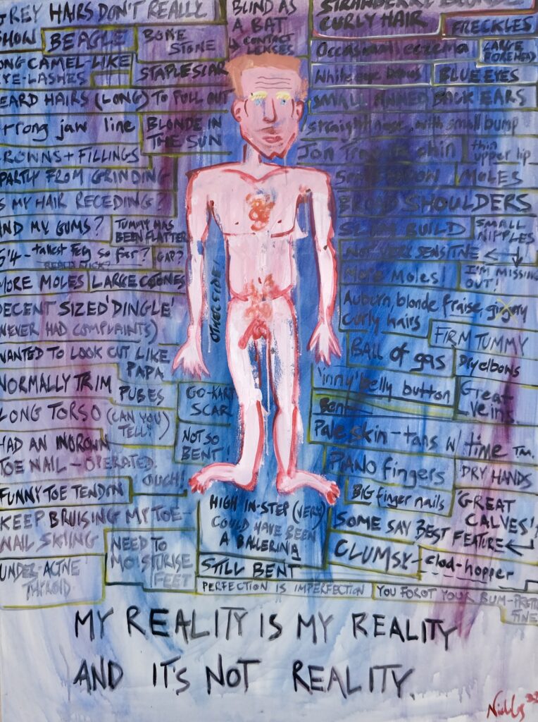 I do however offer commissioned portraits – and these came from the seed of a self-portrait that I created in 2022, entitled ‘self-reflective portrait’. In the self-portrait, I painted a cartoon-like naked figure of me surrounded by all the things I like and dislike primarily about my body. It was a very cathartic exercise and I felt quite vulnerable exposing my thoughts in such a way – but I’m over it now! I used the tagline “my reality is my reality and it’s not reality” to speak to this idea that only I see the full extent of my foibles.