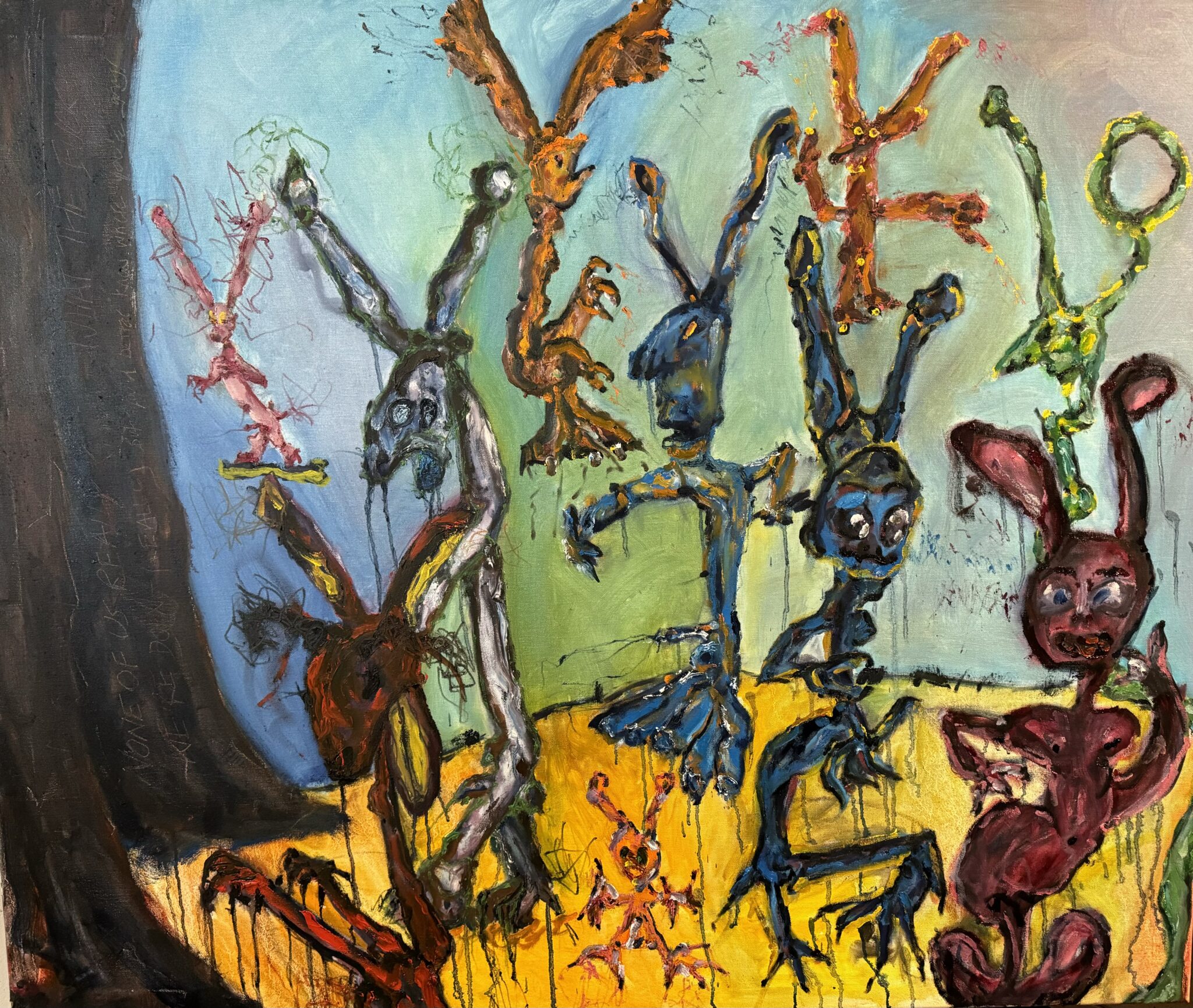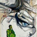 NF: My most recent collection is called “Les debutants” and currently consists of just one painting. It speaks to the privilege of the beginner’s mindset as an opportunity to innovate and break boundaries. I painted it with my left hand, which was challenging as I’m right-handed and forced me to adopt the beginner’s mind. I haven’t decided yet whether this piece will be joined by others. I’ll decide when I get back to my studio.
