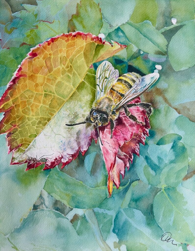 QT:  Painting Plein Air has its challenges: I’ve been stung by a bee, bit by a mosquito behind my ear (which ended up infected), had tiny spiders crawling over my paper, and rained on. The rain mist was actually a happy accident, as it created a unique texture on my paper, but I could definitely do without the bugs!