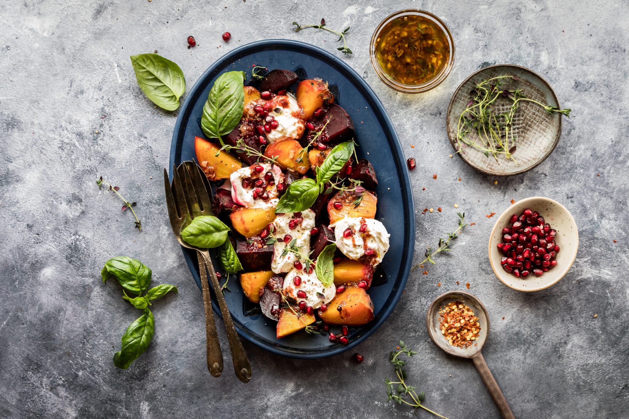 Arrange the cooled beets on a platter or bed of greens. Place the Burrata in the center. Drizzle with pistachio vinaigrette and garnish with microgreens, basil leaves, and remaining crushed pistachios. Sprinkle the Burrata balls with flakey sea salt. Serve immediately with extra vinaigrette on the side.