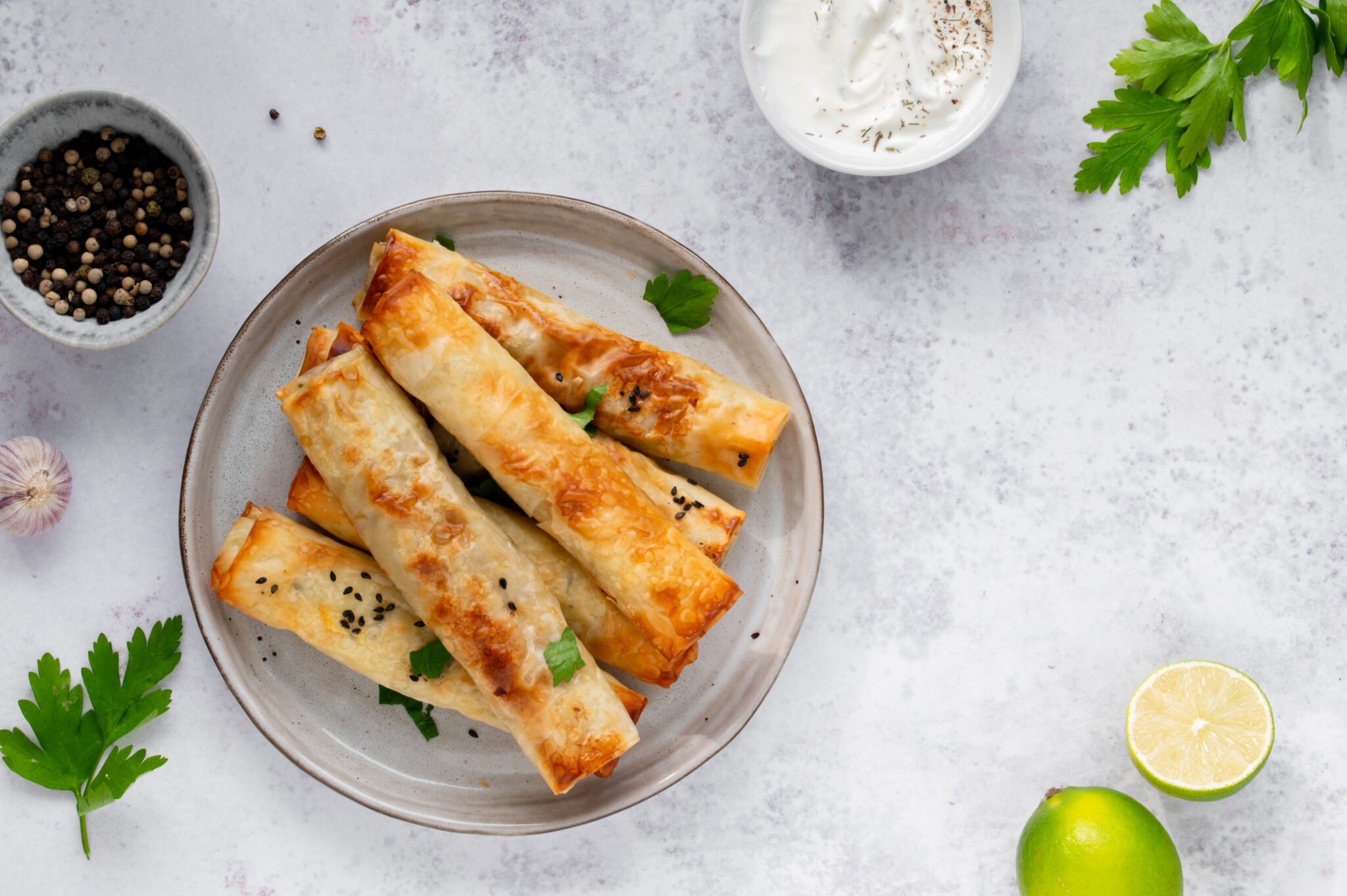 Brush the first phyllo strip with melted butter and place a teaspoon of feta/herb mixture on the bottom right corner of the phyllo sheet, about 1/4-inch from the edge.