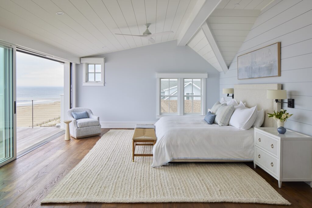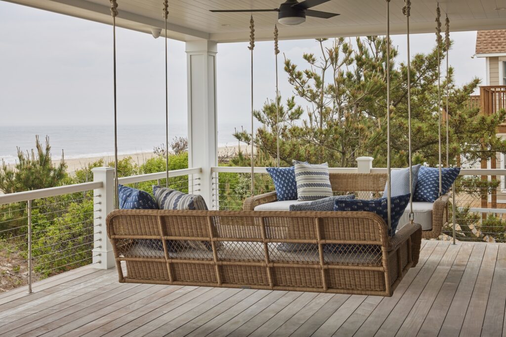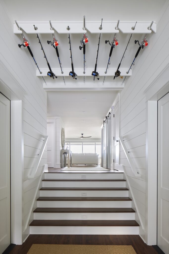 Additional special amenities abound in this custom home, such as an under-stair playhouse, pet feeding station in the butler’s pantry, dog washing station in the beach prep room – another signature Marnie Custom Homes element, fishing rod holders in the ceiling above the ground-level staircase, double swings off the dune-side deck, and a lower-level outdoor bar. Wallpaper in shades of the sea accent built-ins and spaces throughout the home.