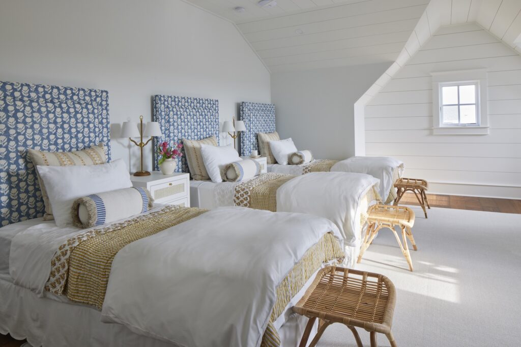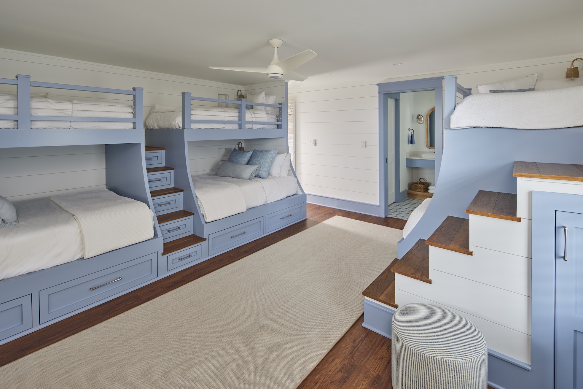 Each of the 10 bedrooms has its own bathroom, including an indoor/outdoor shower in the primary bath. A custom nameplate featuring a beach-themed moniker marks the entrance to each suite. One of Marnie Custom Homes’ signature elements is a bunk room with drawer storage built into the steps, as seen in this soft blue and white bunk room. Bathroom tiles in fun, colorful patterns and textures elevate and personalize each bath.
