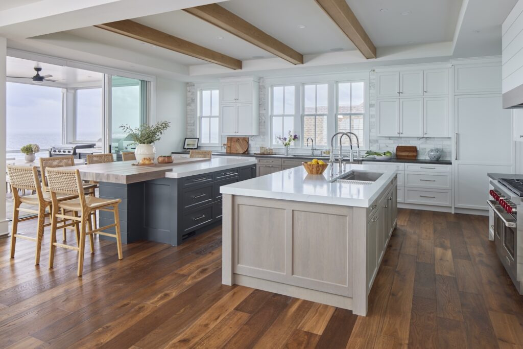 A recent custom home they designed and built is Family Tides, which, at more than 10,000 square feet on four levels with 10 bedrooms and 13 bathrooms, is the ultimate in North Bethany Beach living. Dual kitchen islands sporting steely gray and white oak finishes, as well as abundant perimeter cabinetry in white and white oak, set the tone for the main floor. Open and airy, the kitchen combines porcelain and quartz counters with a custom walnut counter that doubles as a table. A marble backsplash, ceiling beams, and a detailed hood round out the amenities in this true cook’s kitchen.