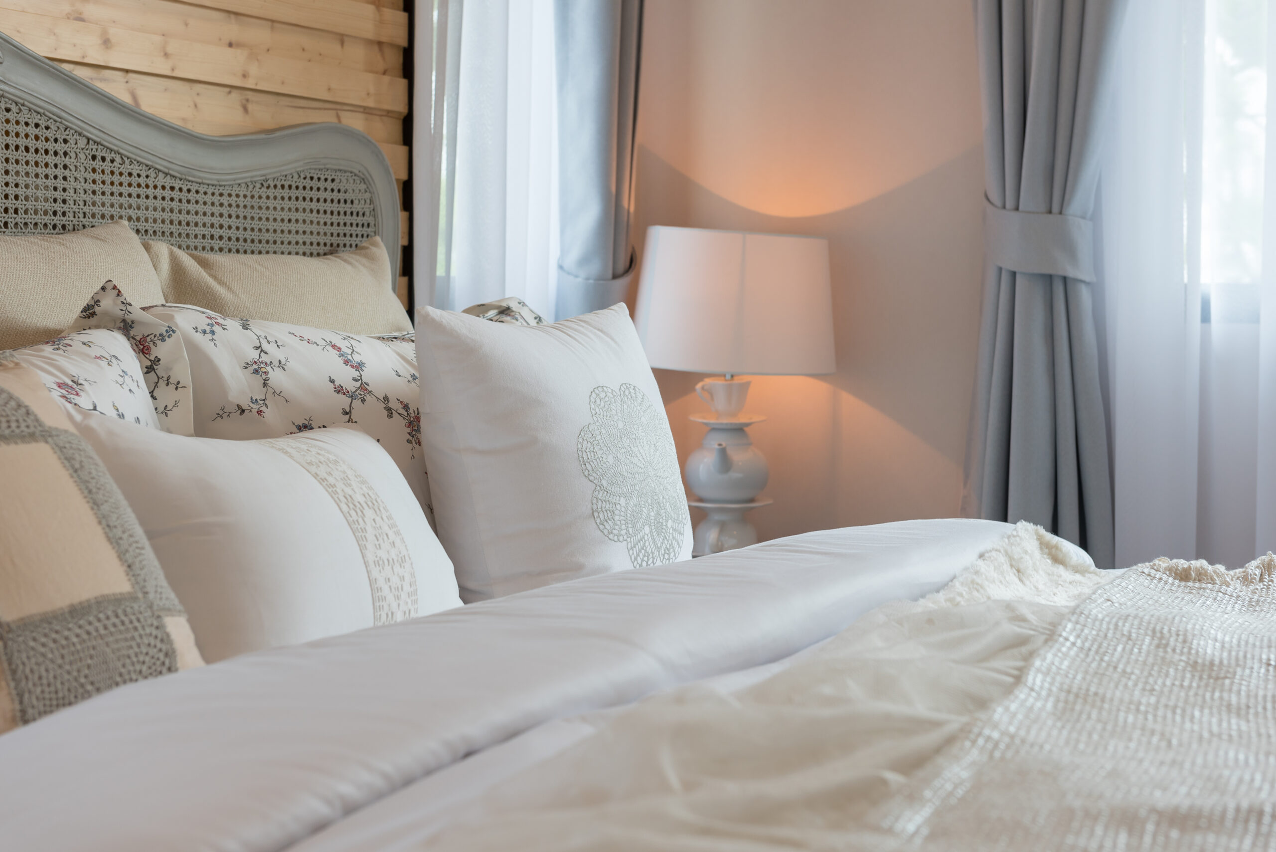 - Layered textures – Quilted shams, matelassé throws