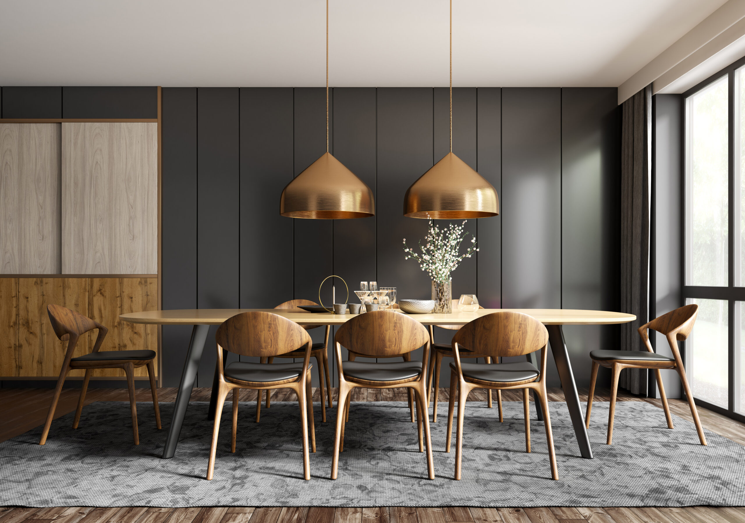 Interior of modern dining room, dining table and wooden chairs against black paneling wall. Home design. 3d rendering
