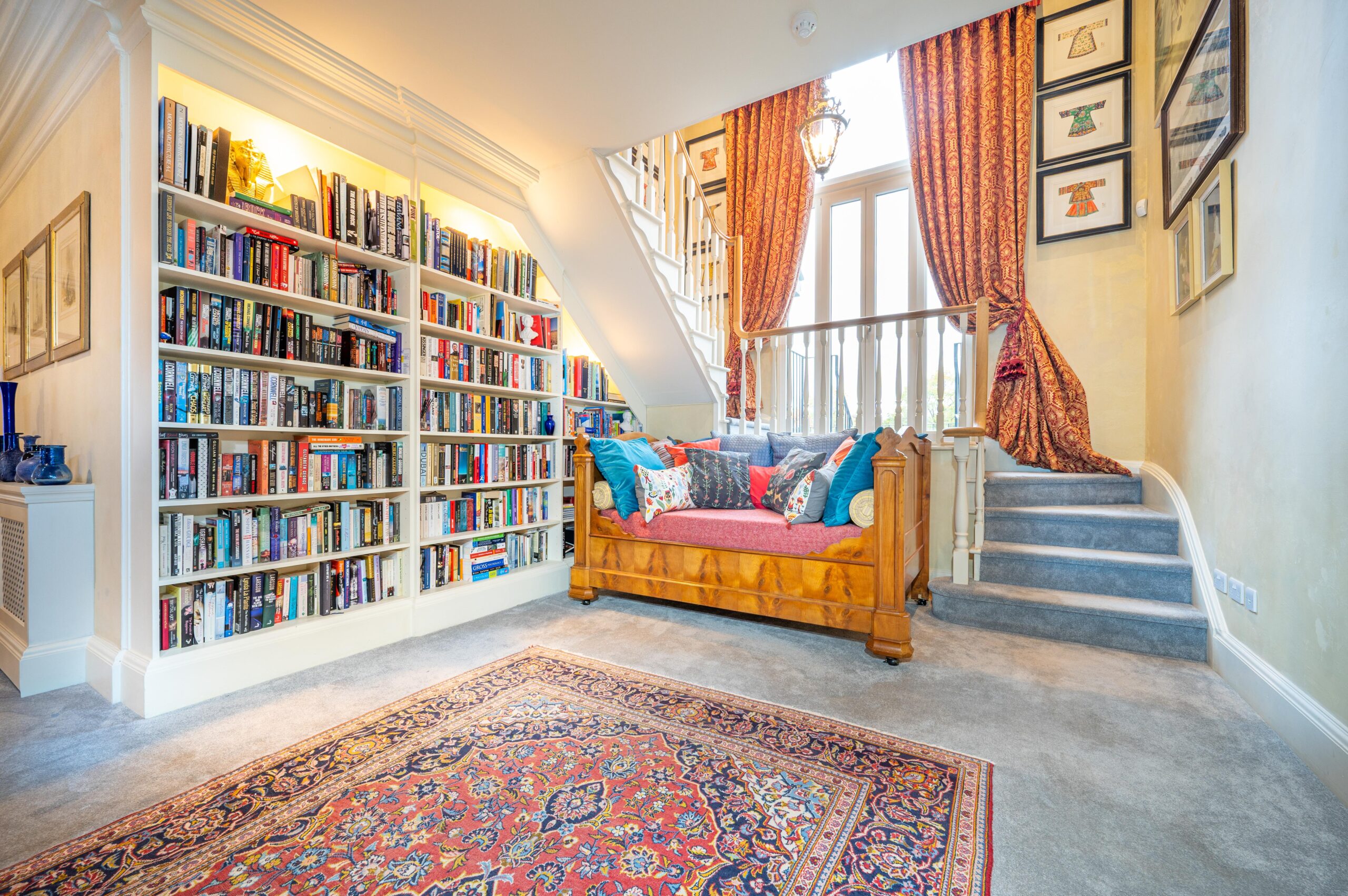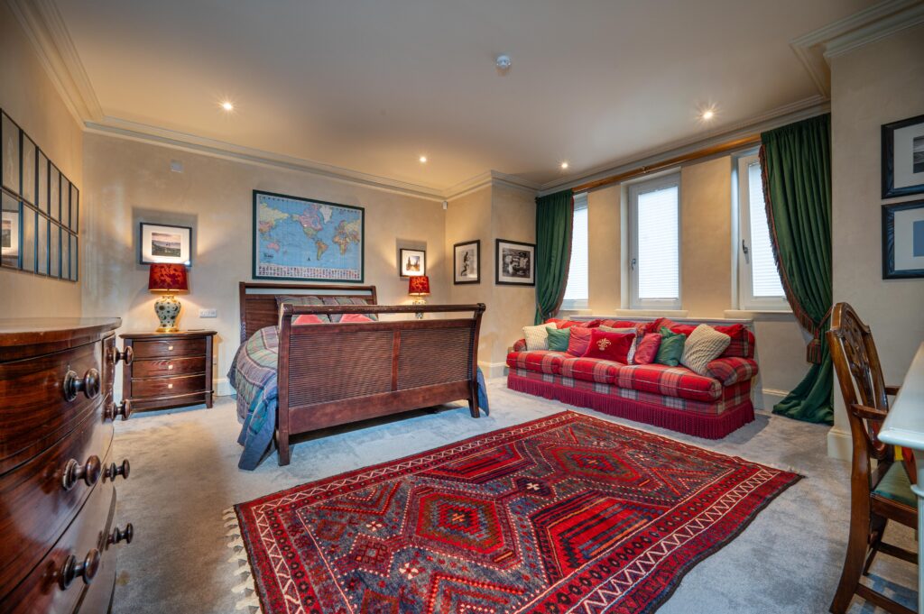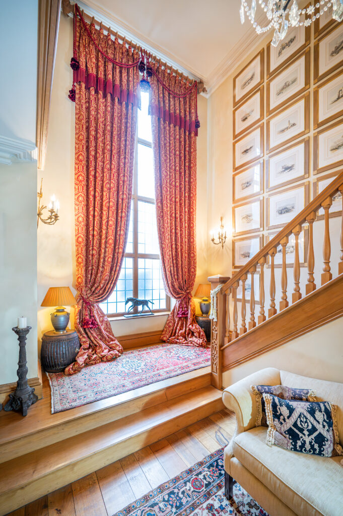 One of the most striking elements of the home lies in its joinery, which was all hand-crafted by the late Simon Elliot, renowned designer and brother-in-law to the Queen. “Simon designed and built all the woodwork himself in his workshop in southern England.” The project also benefited from the refined touch of Lady Victoria Weymouth, a well-known interior designer whose custom fabrics and prints grace the home’s sweeping windows and bespoke curtains. “Lady Weymouth designed all the fabrics, ensuring the house had the right flow, that every room connected naturally to the next. It took about a year of collaboration, but the result is wonderful.”