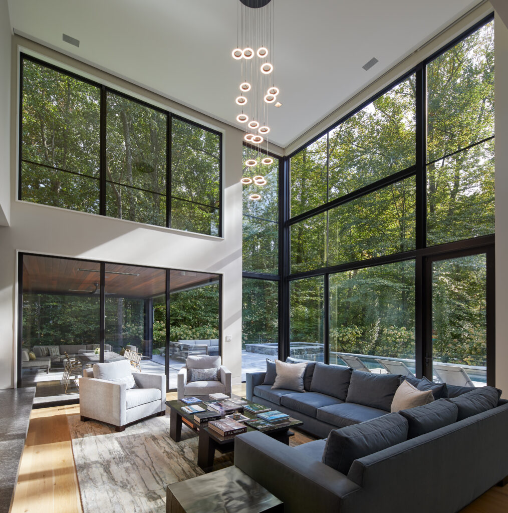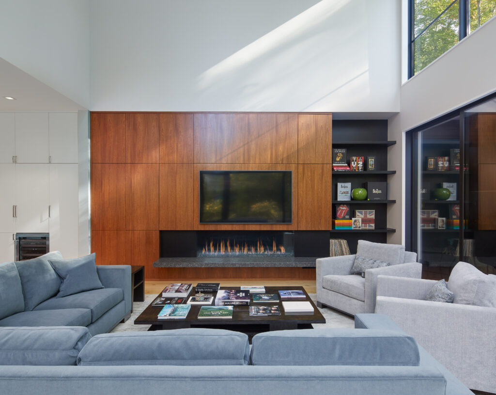 Designed to take in the views of the property, the rear family room is a double height space with two-story glass walls. “The main architectural piece of the room is the custom-designed sapele mahogany built-in that houses a record player, books, games, and a hidden bar behind custom grain-matched doors,” Kaufman says. A unique L-shaped band with open shelves and a DaVinci linear fireplace, plus a fully pocketing door that opens to the screen porch are among the many exceptional amenities in the family room, which connects to the breakfast room and kitchen.