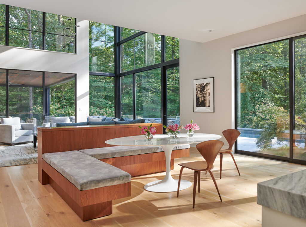 The open white kitchen, which includes a marble backsplash and counter, adjoins the custom-built banquette that houses a hidden tv that lifts with a push of a button. “The banquette is built with sapele mahogany, the same species of wood as the exterior siding,” the architect adds, creating another visual connection from the inside to the outside.