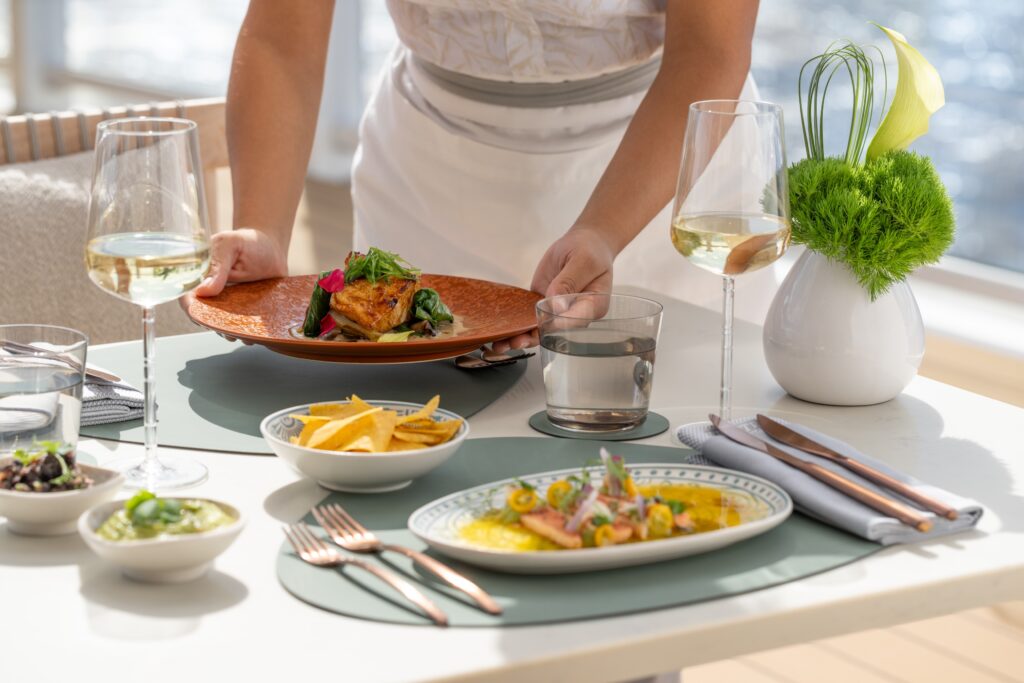 On the Evrima, guests can choose from menus according to their whims. Mistral, an al-fresco, Mediterranean-style eatery, is perfect for sunny lunches or romantic dinners at sea. Seafood from fresh local catch and prime cuts from the grill are staples. Talaat Nam, a Southeast-Asian inspired restaurant (with sushi bar and indoor/outdoor seating), offers dishes like Thai-style salads, spring rolls, curries, sushi, and noodle or rice dishes. At S.E.A., passengers enjoy a high-end tasting menu curated by a Michelin-starred chef. Guests enjoy a multi-course, European-influenced gourmet journey (often with optional wine pairings).